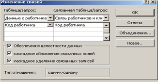 4. Нажать кнопку мыши на поле связи одной таблицы и перетащите его на поле связи в другую таблицу. Как только вы отпустите кнопку мыши, откроется диалоговое окно Изменение связей: