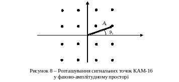 Сукупність сигнальних точок утворює так зване сигнальне сузір'я (signal constellation). Сузір'я на рис.8 містить 16 сигнальних точок, кожна з яких відповідає чотирьом інформаційним бітам, що передаються.