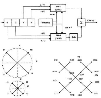 Існує декілька способів практичної реалізації КАМ-16, найпоширенішим з яких є спосіб модуляції накладанням (SPM – Supersposed Modulation). У схемі, що реалізовує даний спосіб, використовуються два однакових модулятора ФМ-4 (рис.6). Структурна схема модулятора SPM і діаграми, що пояснюють його роботу, зображені на рис.9.