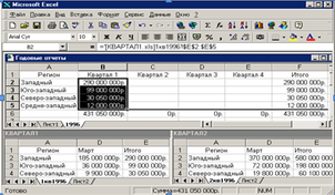 и означает, что ячейка В2, в которой она помещена, связана с ячейкой Е2 рабочего листа 1кв1996 рабочей книги Квартал1. При изменении содержимого исходной ячейки, конечная ячейка также изменится.