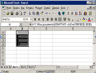 =СУММА(‘[Кварталl.xls]1кв1996’!$Е$2:$Е$5)