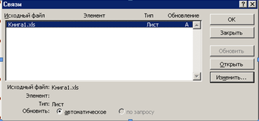 После двойного щелчка по изображению ячеек, на экране появляется рабочий лист с выделенным исходным диапазоном. Быстро вернуться на рабочий лист с изображением можно с помощью клавиши перехода . Обратите внимание на то, что в списке Перейти к диалогового окна Переход находится адрес ячейки рабочего листа, содержащего связанное изображение ячеек. Если вы, не сделав никаких изменений в диалоговом окне, просто нажмете кнопку ОК, то немедленно вернетесь туда, откуда был вызван этот рабочий лист. Чтобы обновить связи или открыть исходный файл с помощью клавиатуры: