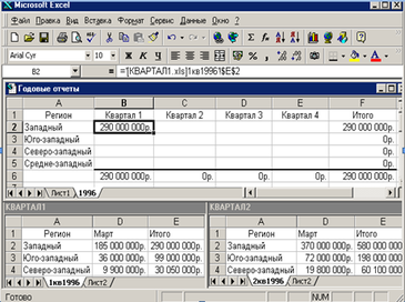 ример 12. На рис. 21 изображены рабочие книги, связанные с помощью внешней ссылки. Рабочая книга Квартал 1 является исходной для рабочей книги Годовые отчеты. В строке формул находится формула внешней ссылки, использованная в рабочей книге Годовые отчеты. Эта формула выглядит следующим образом: