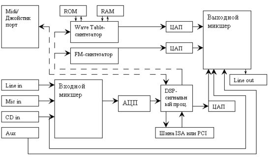 DSP-сигнальный процессор управляет обменом данных со всеми остальными устройствами компьютера через шину ISA или PCI