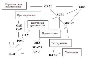 Жизненный цикл изделий (ЖЦИ) включает ряд этапов, начиная от зарождения идеи нового продукта до его утилизации по окончании срока использования. К ним относятся этапы маркетинговых исследований, проектирования, технологической подготовки производства (ТПП), собственно производства, послепродажного обслуживания и эксплуатации продукции, утилизации.