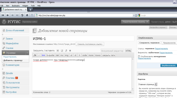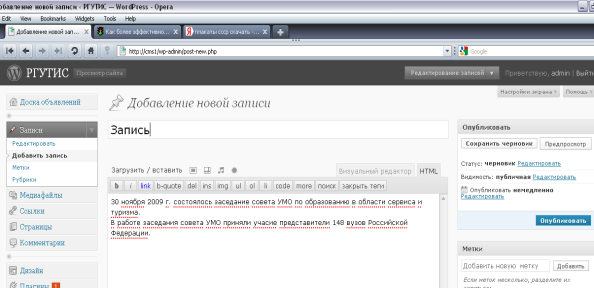 Создадим запись на главной странице. Заходим в запись---добавить запись. Пишем заголовок, ниже все что Вы хотите написать или все что Вы думаете. Публикуем.