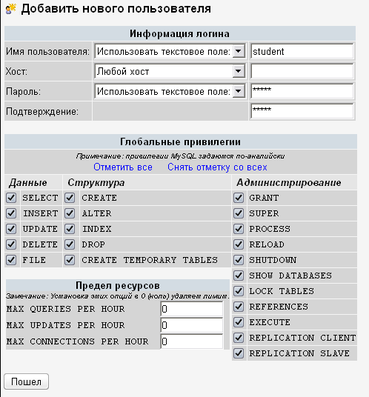 Введите Имя пользователя, пароль (в 2-ух полях) и отметьте все привилегии (ссылка «Отметить все»), нажмите кнопку «Пошел». Запомните пароль и имя, они всегда пригодятся.