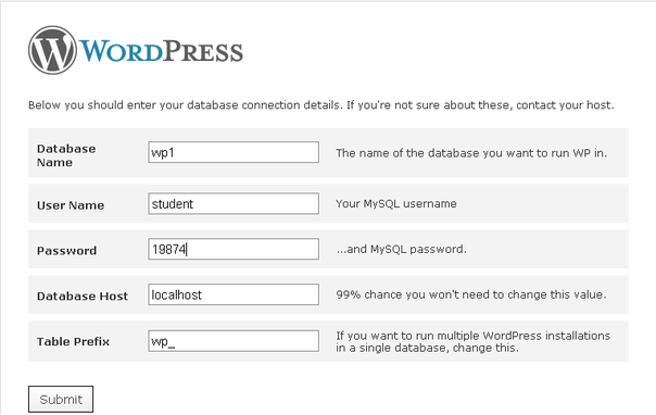 Последний шаг установки. Здесь вам нужно ввести: имя базы данных, имя пользователя базы данных и пароль пользователя базы данных