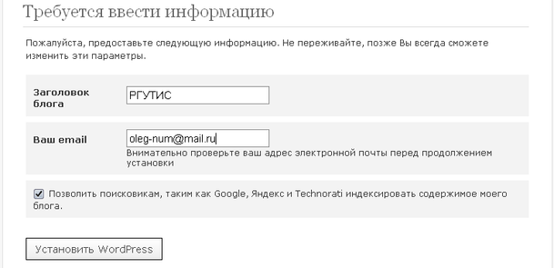 Затем жмите кнопку “Запуск инсталляции”. В следующем окне вводите название блога и e-mail. Затем система выдаст вам логин admin и пароль. Запишите пароль. Он нужен для входа в админ панель Wordpress.