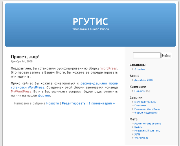 Представленный ниже скриншот показывает стандартное завершение установки, так будет выглядеть Ваш блог. В интернете существует множество различных тем, шаблонов и дополнений к данной программе, мы же рассмотрим стандартное ее приложение, принцип работы все равно не измениться.