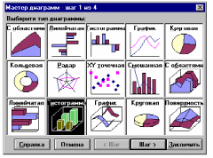 — «Тип диаграмм» панелі інструментів. Натискання на цю кнопку виводить на екран палітру типів діаграм, запропонованих вам на вибір.