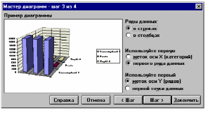 Серія даних, розташована уздовж вісі Х, називається рядом, уздовж вісі Y — категорією. Верхній вибір третього вікна «Ряды данных ... в строках, ... в столбцах» дозволяє міняти ряди й категорії місцями.