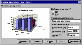 — «Вставить диаграмму» на панелі інструментів. Після запуску Graph на екран виводиться панель «Мастер диаграмм». Майстер пропонує послідовність діалогових вікон, які допомагають здійснити основні етапи формування діаграми. У кожному вікні виводиться зразок, який дозволяє контролювати формування діаграм. Майстер дозволяє визначити тип і формат діаграми, спосіб представлення даних, додати заголовок діаграми, так звану легенду (пояснення позначень), заголовки кожної вісі тощо.