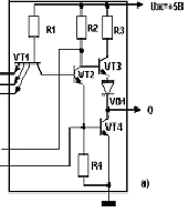В Інтегральній техніці знайшли застосування декілька типів основних логічних схем, які відрізняються елементами, що реалізують логічну операцію "1" чи "АБО", а також методом зв'язку між схемами в послідовних колах. Найбільшого поширення при виготовленні елементів малої і середньої степені інтеграції набула транзисторно-транзисторна логіка (ТТЛ). Елементи ТТЛ характерні тим. що з для зменшення впливу ємнісного навантаження (тобто з для підвищення швидкодії) вхідне коло таких елементів виконується на основі багатоемітерного транзистора по схемі з спільною базою, який має низький вхідний опір. В таких схемах необхідно, щоб коло, яке є генератором для багатоемітерного транзистора, при відключенні останнього було низькоомним і забезпечувало б швидке розсмоктування неосновних носіїв, накопичених в базі багатоемітерного транзистора. Для цього вихідний каскад попереднього однотипного елементу повинен бути достатньо потужним і низькоомним. Схема типового базового елемента ТТЛ представлена на рис 2. Даний елемент реалізує функцію "І-НІ в додатній логіці і функцію "АБО-НІ у від'ємній логіці, причому на транзисторах VТ2–VТ4 реалізовано складний інвентор, який здійснює операцію "НІ". Таке схемне рішення дозволило забеспечити високу навантажувальну здатність, достатню швидкодію і завадостійкість схеми, оскільки струм в закритому стані схеми створюється малим вихідним опором емітерного повторювача, зібраного на транзисторі VТЗ. а у відкритому стані струм, що поступає в схему, забезпечується малим вихідним опором відкритого транзистора VТ4.