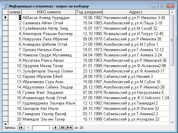 SELECT Общая. номер, Общая.[ИФО клиента], Общая.[Год рождения], Общая. Адресс FROM Общая;