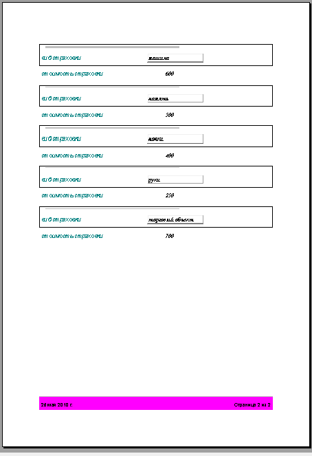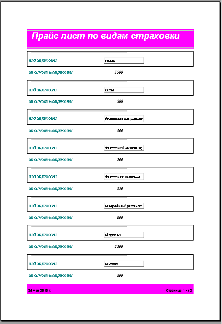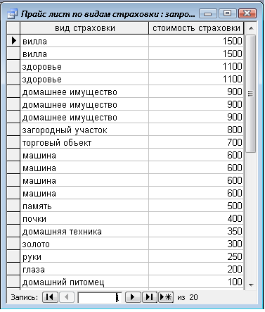 Так же и второй отчёт на запрос прайс листа по видам страховок: