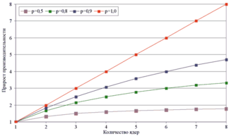 Как видно из приведенной формулы, прирост производительности в случае многоядерной архитектуры процессора в большой степени зависит от оптимизации приложения к многоядерной архитектуре, то есть от его способности распараллеливаться. К примеру, даже в случае, когда 90% программного кода распараллеливается на несколько исполнительных ядер, использование четырехъядерного процессора позволяет получить только трехкратный прирост производительности в сравнении с одноядерной архитектурой процессора.
