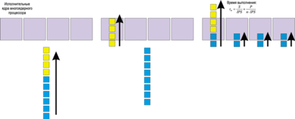В случае использования n-ядерного процессора (рисунок 1) время, затрачиваемое на выполнение всего программного кода, окажется меньше за счет параллельного выполнения P команд на n ядрах процессора и составит: