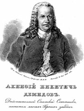 Акинфий Никитич Демидов (1678-1745), действительный статский советник, основатель многих горно-металлургических заводов Урала и Алтая, создатель первой в России эталонной коллекции руд и минералов. Ее ядром являлся минеральный кабинет немецкого химика и металлурга Иоганна Фридрика Генкеля, купленный во Фрайберге и пополненный образцами Уральских и Сибирских руд. Коллекция поступила в Московский университет в 1759 г. через куратора графа И.И. Шувалова.