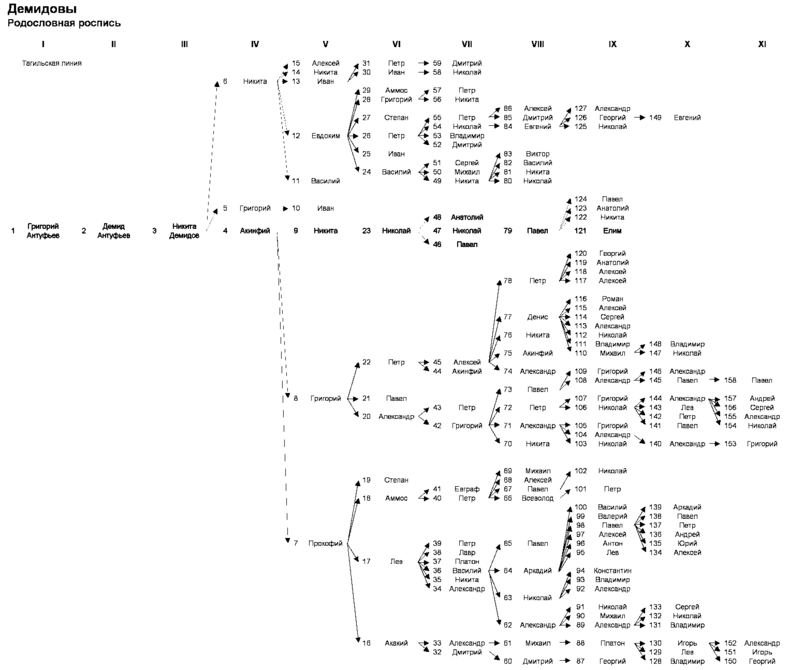 Один взгляд на родословное древо Демидовых (см. следующую страницу и приложение), восстановленное далеко не полностью, производит глубокое впечатление. Невольно приходит мысль о том, что человек не песчинка в океане истории, он может и должен оставить глубокий след своими деяниями, особенно если его усилия умножены многочисленными потомками. К сожалению, в настоящее время не все известно даже о самых выдающихся представителях этого знаменитого рода, начало возвышения, которого неразрывно связано с эпохой Петра и Уралом.