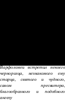 Старец воздел руки, возвел очи к небу, вздохнув пред Богом, усердно помолился и после молитвы сказал: «Аминь». Бережно достав из кармана, он, как некое сокровище, тремя пальцами подал Варфоломею нечто похожее на анафору 27, с виду маленький кусок белого пшеничного хлеба — святой просфоры, и сказал ему: «Открой уста свои, чадо, возьми это и съешь — это тебе дается в знамение благодати Бо-жией и понимания Священного Писания. Хотя и маленькой кажется частица, которую я даю тебе, но велика сладость вкушения от нее». Отрок открыл уста и съел то, что ему было дано, и была сладость во рту его. как от сладчайшего меда. И он произнес: «Не об этом ли сказано: Как сладки гортани моей слова Твои! Лучше меда устам моим [Пс. 118. 103], и душа моя весьма возлюбила их». Старец ответил ему: «Если веруешь, больше этого увидишь. А о грамоте, чадо, не скорби: знай, что отныне Господь дарует тебе хорошее знание грамоты, большее, чем у твоих братьев и сверстников» — и поучил его на пользу души.