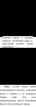 Сотворив эту молитву, преподобный осенил крестным знамением место, где стояла дождевая вода, и вдруг из-под земли забил полноводный источник, который бьет и поныне и из которого берут воду для всех монастырских нужд, благодаря Бога и Его угодника Сергия. От воды из этого источника случались многочисленные исцеленш больных, страдавших разными недугами, если болящие приходили к источнику с верой. Исцелений сподобляются не только те, кто приходит к источнику.— многие приезжают из далеких областей, черпают воду из ключа и увозят домой, чтобы напоить и окропить болящих, которьн также получают исцеление. Такие случаи бывали не однажды или дважды, но без счета, бывают они и в наши дни57. С того времени источнш в течение десяти или пятнадцати лет называли Сергеевым, но мудрьн муж, не терпя славы, на это сердился и говорил: «Чтобы я никогда н< слышал, как вы называете этот ключ моим именем, потому что не я да; вам воду, но Господь даровал ее нам, недостойным».