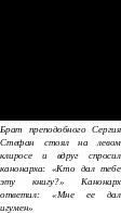 И вот, пока они еще продолжали беседу, в монастырь со славой и почестями прибыл некий князь, окруженный воинами, боярами, приближенными и слугами. Шедшие впереди телохранители и слуги князя, схватив крестьянина за плечи, с силой оттолкнули его и от князя и от Сергия. Еще издалека князь поклонился Сергию до земли, и Сер-гиЙ благословил его; они поцеловались и вдвоем сели, все остальные стояли рядом. Крестьянин же ходил кругом, чтобы через народ разглядеть того, кем он пренебрег и кого он презрел; он безуспешно хотел протиснуться сквозь толпу и посмотреть или дотронуться до преподобного. Наконец он обратился к одному из стоявших там: «Скажи мне, кто тот старец, который сидит справа от князя?» Его собеседник посмотрел на него и сказал: «Ты не здешний? Разве ты не знаешь преподобного отца Сергия? Это он говорит с князем». Услышав это, крестьянин затрепетал от стыда и страха.