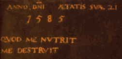 Кристофер Марло году. Но не в конце мая , когда в Стрэтфорде на Эйвоне родился «официальный Шекспир» , а примерно месяцем раньше . когда в одном из замков на берегу той же речки родился «Эйвонский лебедь» (именно так окрестил в 1623 году покойного «Шекспира» Бен Джонсон в предисловии к знаменитому Большому Фолио). И , видимо, именно тайна рождения может объяснить смысл загадочного девиза студента колледжа «Корпус Кристи» Кристофера Марло : «Qvod me nutrit me destrvit» Девиз на портрете ( «То , что меня кормит , меня убивает»). Этот девиз начертан на портрете, обнаруженном при реконструкции помещения колледжа «Корпус Кристи» уже в середине XXвека. Портрет написан по случаю совершеннолетия изображенного на нем мужчины ; идентификация произведена по изображенной там же дате : «1585 год от Рождества Христова Совершеннолетие 21 год» По сохранившимся спискам студентов установлено , что в 1585 году из всех студентов колледжа только Кристоферу Марло исполнился 21 год.