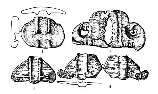 Камень. Ширина 11,3, высота 8 см. Два ребра с перемычками, у основания одного из них сквозное отверстие, еще одно открытое отверстие имеется на кромке в верхней части изделия между концами граней. Желобок между ребрами имеет ширину около 3 см. (Рис.1: 1).