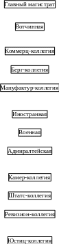 Взамен устаревшей системы приказов в 1717-1718 гг. было создано 12 коллегий, каждая из которой ведала определенной отраслью или сферой управления и подчинялась Сенату. Главными считались три коллегии: Иностранная, Военная и Адмиралтейство. В компетенцию Комерц-, Мануфактур- и Берг-коллегии входили вопросы торговли и промышленности. Три коллегии ведали финансами: Камер-коллегия - доходами, Штатс-коллегия - расходами, а Ревизион-коллегия контролировала поступления доходов, сбор податей, налогов, пошлин, правильность расходования учреждениями отпущенных им сумм. Юстиц-коллегия ведала гражданским судопроизводством, а Вотчинная, учрежденная несколько позже, - дворянским землевладением. Фактически, на правах коллегии существовал учрежденный в 1720 года Главный магистрат, ведавший русскими городами, всем посадским населением; ему подчинялись магистраты и ратуши всех городов.