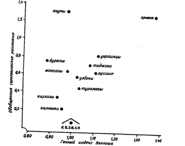 проведенный серологический анализ отражает один из путей микроэволюционного развития современных казахов и одновременно демонстрирует, в каком соотношении у них сохранились исходные генетические особенности, а также показывает их условное расстояние в этноантропологическом развитии от популяций сопредельных территорий.
