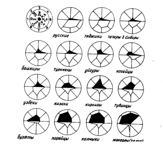 Как известно, специфическое сочетание полиморфных признаков кожного рельефа пальцев и ладони обладают высокой таксономической ценностью. Эти дерматоглифические данные по современным этническим группам сейчас широко используются в антропологической науке. В полученных материалах весь комплекс признаков дерматоглифики свидетельствует об однородности локальных групп казахов и ее гомогенности как популяций в целом. По основным свойствам кожных узоров казахи находятся на стыке монголоидно-европеоидных групп", т. е. относятся к популяциям метисного происхождения (рис.5).