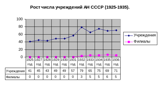 В ходе перестройки деятельности АН претерпела изменения и ее структура. В 1928 г. АН имела в своем составе институты: Физико-математический им. В.А. Стеклова, Сейсмологический, Химический, Почвенный им. В.В. Докучаева, Физиологический, Яфетический, Кавказский историко-археологический и Институт буддистской культуры.