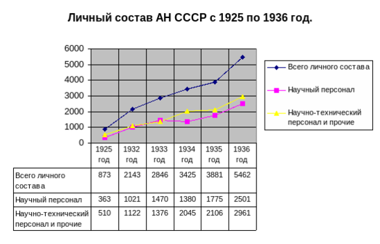 Академия наук финансировалась государством (бюджет АН утверждался СНК), была полностью подчинена СНК, можно сказать она была одним из государственных учреждений. Масштабы деятельности АН изменились столь значительно, что в своем прежнем составе АН не смогла бы справиться со своими новыми задачами. Так как деятельность АН была непосредственно связана с производством, то и при расширении высококвалифицированных научных кадров делали уклон на специалистов технических наук.