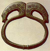 ак, ажурные пряжки с зооморфными (животными) изображениями отличаются единством стиля и высоким мастерством исполнения. Почти все пряжки этого типа полуовальные, различаются лишь размерами и количеством сюжетных композиций. Одна из пряжек Бежтинского могильника экспонируется в музее в разделе археологии. Пряжка обрамлена рамкой из “елочки”, а также тремя многолепестковыми розетками, помещенными под каждой петлей. Внутреннее пространство пряжки разделено на две части горизонтальным стержнем, также украшенным “елочкой”. В нижней части — композиция, образованная двумя вздыбленными конскими фигурами в профиль, симметрично расположенными по обе стороны витого стержня. В верхней части композиции — стилизованные головы медведей, обращенные вверх в сторону, противоположную фигурам коней.