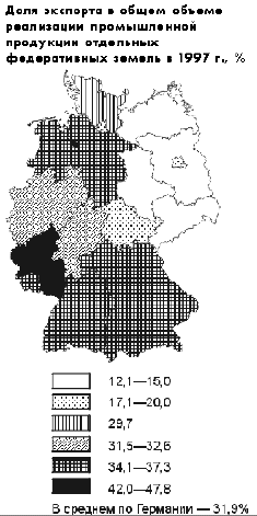 О неустойчивости экономики Восточной Германии в новых условиях свидетельствуют относительно слабые ее позиции на внешних рынках. При доле в общей площади страны около 30%, в населении — около 19% и в общем числе занятых в экономике — около 17% на Восточную Германию приходится лишь около 9% занятых в промышленности страны, 11—12% общего производства валового внутреннего продукта, около 6% производства промышленной продукции, около 4% производства товарной продукции обрабатывающей промышленности и лишь около 3% экспорта промышленной продукции. Доля экспорта в общей реализации продукции обрабатывающей промышленности Восточной Германии в 1998 г. — 18,4%, почти вдвое ниже, чем в Западной (35,6%). Одним из признаков слабости восточных земель считают недостаточное внимание к научным исследованиям и разработке новой конкурентоспособной продукции.