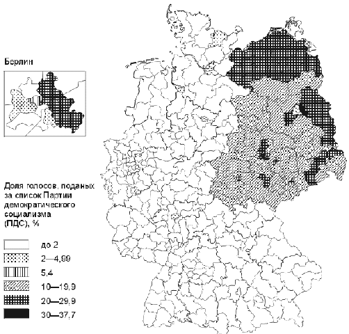 В политической сфере хорошим индикатором различий между обеими частями Германии могут служить результаты голосования избирателей за Партию демократического социализма (ПДС), считающуюся политической наследницей Социалистической единой партии Германии (СЕПГ), игравшей главную роль в политической системе ГДР. Результаты выборов в бундестаг ФРГ, проведенные в 1990, 1994 и 1998 гг., а также в ландтаги восточных земель показывают наличие у значительной части их населения ностальгии о недалеком прошлом, которая не ослабевает, а даже имеет тенденцию к росту. Если в Западной Германии ПДС, стремящейся превратиться из восточногерманской региональной партии в общегерманскую, до последнего времени не удалось преодолеть пятипроцентный барьер ни в одном из избирательных округов, то в Восточной доля голосов, поданных за нее, нигде не опускается ниже 10%. В 1998 г. в новых землях она варьировала от 20,0% в Саксонии до 23,6 в Мекленбурге—Передней Померании, что обеспечило общее повышение по Германии доли голосов за ПДС до 5,1% и право на формирование в бундестаге официальной фракции, насчитывающей 35 депутатов. Можно предположить, что среди причин этих различий существенную роль играют, помимо провалов в социальной политике правящих кругов современной Германии, также и воспоминания избирателей о социальных достижениях прежней ГДР — таких, как отсутствие безработицы, низкая квартплата, создание развитой системы помощи многодетным семьям и матерям-одиночкам, возможность практически почти бесплатного пользования детскими яслями, садами, пионерскими лагерями и т. п.