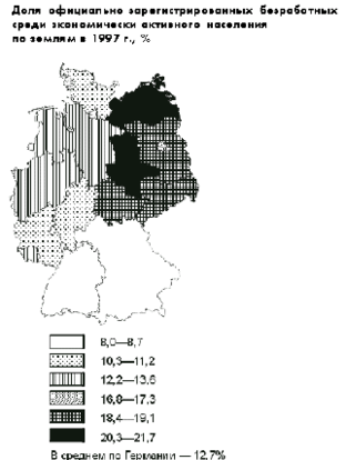 В восточных землях, по официальным данным, безработица почти вдвое больше, чем в западных (в 1997 г. — соответственно, около 20 и 11%).