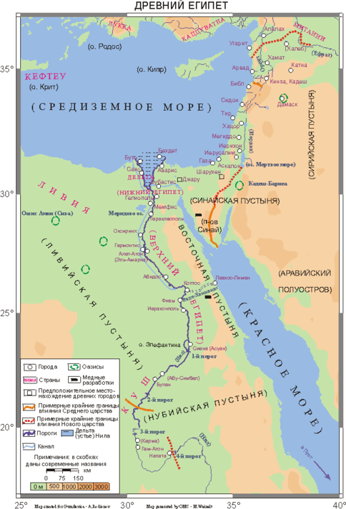 Древнеегипетская история условно разделена на периоды: Раннее царство (I–II династии) – 3000–2778 до н.э.; Древнее царство (III–VI династии) – 2778–2263 до н.э.; Первый переходный период (VII–X династии) – 2263–2070 до н.э.; Среднее царство (XI и XII династии) – 2160–1785 до н.э.; Второй переходный период (XIII–XVII династии) – 1785–1580 до н.э.; Новое царство (XVIII–XX династии) – 1580–1085 до н.э.; поздний период (XXI–XXX династии) – 1085–332 до н.э., который завершился завоеванием страны Александром Великим. Приведенные даты следует рассматривать как приблизительные, причем более точны позднейшие из них, тогда как самые ранние могут иметь погрешность в пределах нескольких столетий.