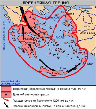 Примерно в 19 в. до н.э. в центральную Грецию и на Пелопоннес началось вторжение индоевропейских племен с севера. Пришельцы – ахейцы, эолийцы, ионийцы и, наконец, ок. 1100 до н.э. дорийцы – говорили на разных диалектах греческого языка. В 16 в. до н.э. в Греции расцвела ахейская цивилизация, обычно именуемая микенской; первоначально она пребывала под властью минойского Крита или во всяком случае испытывала значительное влияние с его стороны. В ходе широкомасштабных раскопок Микен, Тиринфа и Пилоса в Греции, Трои в Малой Азии, Кносса и других мест на Крите были обнаружены ювелирные изделия, оружие, керамика, глиняные таблички с иероглифами и линейным письмом.