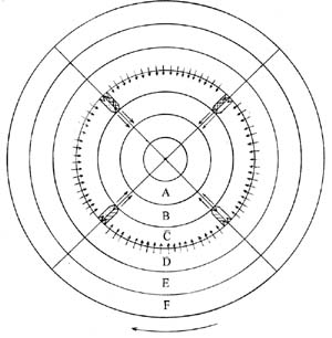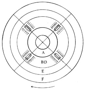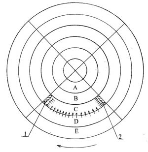 На рис. 2 изображена в разрезе, система миров. Пять сфер миров я обозначил буками от А до Е. сферу миров, в которую входит и наш мир я обозначил буквой С. Итак в сферу миров С в нашем мире надо создать две хардиевые заглушки 1 и 2 (они изображены в разрезе). Как видно на рисунке 1 хардиевая заглушка состоит из трех сегментов: С1, С2 и С3. Конечно такую заглушку очень трудно сделать целиком, поэтому она будет состоять из множества мелких элементов, но основных сегментов должно быть три.