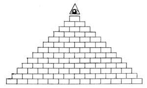 Главный символ системной религии – четырехгранная пирамида с квадратом в основании. Почему пирамида? Потому что сам человек в течение всей жизни выстраивает пирамиду своей физической и психической эволюции. Такая пирамида изображена на рис. 8. Пирамида состоит из тринадцати рядов кирпичей. Пять нижних рядов кирпичей должны быть окрашены в красный цвет. Красный цвет – означает рождение и детство человека.
