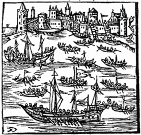 Набіг козаків на чолі з П.К.Сагайдачним на Кафі (Феодосію) у 1615 році. З російської гравюри на дереві. XVII століття.