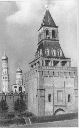 Башня с главными воротами Кремля и в те времена производила неизгладимое впечатление стройностью пропорций, богатством белокаменных украшений фасадов, состоящих из башенок, резных столбиков, колонок, фигур фантастических животных. По углам четверика находились пирамидки с золочеными флюгерами.