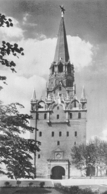 В том же 1495 г. была заложена Троицкая проездная башня с отводной стрельницей при ней. Троицкая башня - самая высокая башня Кремля - по значению считалась второй после Спасской. Как и Фроловская башня, она имеет двойные стены. Массивный четверик башни имеет шесть ярусов, в ее основании - двухъярусный подвал с мощными стенами. Все ярусы соединены друг с другом лестницами. Первоначально башня называлась Богоявленской, затем Знаменской, Куретной. Поуказу царя Алексея Михайловича в 1658 году она стала называться Троицкой по находящемуся рядом Троицкому монастырскому подворью.