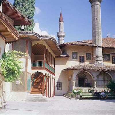 Из отдельных построек любопытны Соколиная башня и киоск на мраморных колонках в персидском саду. По близости находятся там руины старого дворца, указанного на плане прошлого века, остатки больших бань, глубокого бассейна с фонтаном и террас, еще не разобранных от дворцовых садов, напоминавших, по преданию, подобие висячих садов Семирамиды. За пределами сада, одиноко на холме, стоит тюрбе Дилара-Бикеч, любимой жены Крым-Гирея: уже при Муравьеве в 1820 г. дверь тюрбе была заложена, а ныне и окна – камнями, прежней оловянной крыши нет, и здание скоро превратится в развалину.