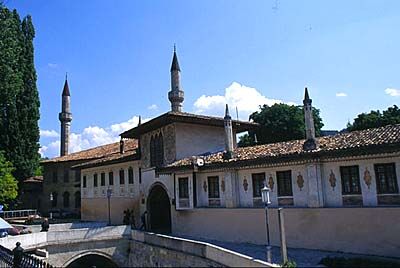 Бахчисарайский дворец построен около 1519 года, и первая резиденция, точнее – первый притон орды был устроен в Салачике, в нескольких верстах от Бахчисарая, где долина образует особенно глухое ущелье, близ Успенского пещерного скита и по соседству недоступной крепости Чуфуте-Кале. От этого первого дворца, слепленного ордой, не осталось и следов, как нет их от Великого Сарая, но прекрасное тюрбе с резным входом, сооруженное в 1501 году Менгли-Гиреем над прахом отца Хаджи-Гирея, еще стоит поныне при повороте к Успенскому скиту. От XIII– XV веков мы имеем несколько кладов, найденных в Симферополе, Бердянске, Мариуполе, Ставрополе Кавказском: много вещей из золота, много уборов тончайшей зернистой филиграни, бляшки от ременных поясов, коробочки, носимые на груди с листиками Корана, из листового золота и украшенные арабесками. Все это – или вещи привозной арабской промышленности, или изделия местные, но по образцам, данным культурными центрами Поволжья. Таким образом, Крымская орда явилась готовой к усвоению мусульманской культуры Стамбула, и ханы, в качестве передового вассала Турецкой империи, спешили перенимать обстановку султана, и так как постройки всегда делались легкими, как и в самом Стамбуле, то во дворце производились, видимо, постоянные переделки, и от старого оставались нередко только отдельные палаты, сложенные из камня, подобно Дивану, и части, подобные воротам, фонтанам и т.д. Когда войска Миниха взяли Бахчисарай, адъютант Манштейн, оставивший записки, видел еще во дворце смесь старого с новым, татарского с турецким и восточного с европейским.