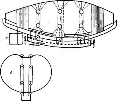 Дирижабль Циолковского имел следующие характерные особенности. Во – первых, это был дирижабль переменного объема, что позволяло сохранять постоянную подъемную силу при различных температурах окружающего воздуха и различных высотах полета. Возможность изменения объема конструктивно достигалась при помощи особой стягивающей системы и гофрированных боковин (рис. 1)