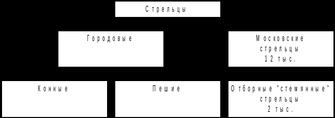 Войско обычно делилось на полки: большой (главная часть войска), передовой (авангард), правой руки (левый фланг), сторожевой (арьергард). В том же году появляется войско из стрельцов – воинов, вооруженных не только холодным оружием, как дворянская конница, но и огнестрельным пищали, насчитывавшее несколько тысяч человек.