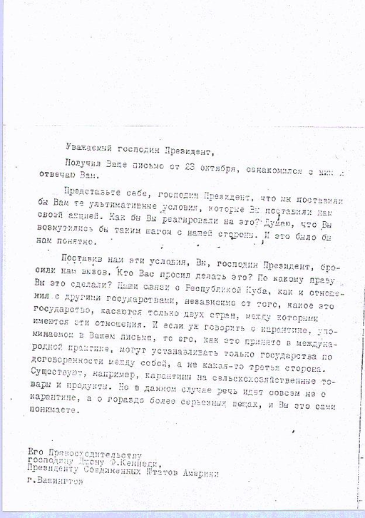 Уважаемый г-н президент. Я с большим удовлетворением ознакомился с Вашим ответом г-ну Рану о том, чтобы принять меры, исключить соприкосновение наших судов и тем самым избежать непоправимых роковых последствий. Этот разумный шаг с Вашей стороны укрепляет меня в том, что Вы проявляете заботу о сохранении мира, что я отмечаю с удовлетворением. Вы хотите обезопасить свою страну, и это понятно. Все страны хотят себя обезопасить. Но как же нам, Советскому Союзу, нашему правительству оценивать ваши действия, которые выражаются в том, что вы окружили военными базами Советский Союз, расположили военные базы буквально вокруг нашей страны. Разместили там свое ракетное вооружение. Это не является секретом. Американские ответственные деятели демонстративно об этом заявляют. Ваши ракеты расположены в Англии, расположены в Италии и нацелены против нас. Ваши ракеты расположены в Турции. Вас беспокоит Куба. Вы говорите, что беспокоит она потому, что находится на расстоянии от берегов Соединенных Штатов Америки 90 миль по морю. Но ведь Турция рядом с нами, наши часовые прохаживаются и поглядывают один на другого. Вы что же считаете, что Вы имеете право требовать безопасности для своей страны и удаления того оружия, которое Вы называете наступательным, а за нами этого права не признаете. Вы ведь расположили ракетное разрушительное оружие, которое Вы называете наступательным, в Турции, буквально под боком у нас. Как же согласуется тогда признание наших равных в военном отношении возможностей с подобными неравными отношениями между нашими великими государствами. Это никак невозможно согласовать. Поэтому я вношу предложение: мы согласны вывезти те средства с Кубы, которые Вы считаете наступательными средствами. Согласны это осуществить, и заявить в ООН об этом обязательстве. Ваши представители сделают заявление о том, что США, со своей стороны, учитывая беспокойство и озабоченность Советского государства, вывезут свои аналогичные средства из Турции. Давайте договоримся, какой нужен срок для вас и для нас, чтобы это осуществить. И после этого доверенные лица Совета Безопасности ООН могли бы проконтролировать на месте выполнение взятых обязательств.